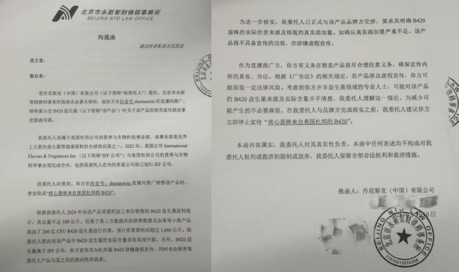 2025年,一份有关菌小宝B420益生菌的律师函在网络上流传。文件表示,受丹尼斯克(中国)有限公司委托,北京市永新智财律师事务所就某知名主持人,在相关直播间宣称其“核心菌株是来自美国杜邦的B420”进行沟通。