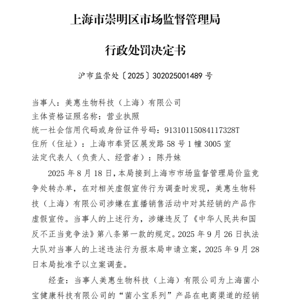 近日,上海市崇明区市场监督管理局公示的行政处罚决定书显示,当事人美惠生物科技(上海)有限公司为上海菌小宝健康科技有限公司的“菌小宝系列”产品在电商渠道的经销商,负责所有与该产品销售相关的广告投放、市场推广及销售活动。