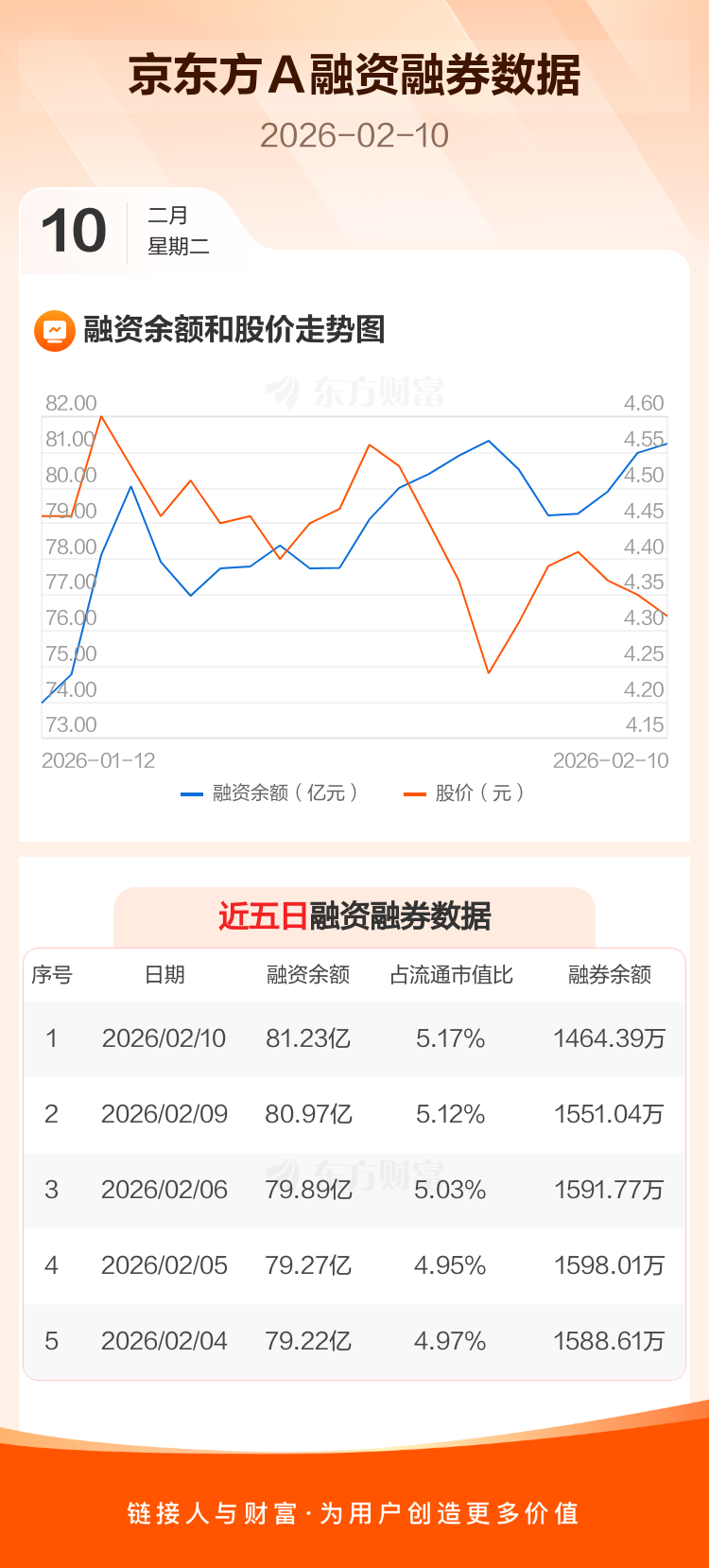 交易所最新数据显示,京东方A于2026年2月10日获融资买入3.68亿元,融资偿还3.42亿元,当日融资净买入2575.75万元。目前,该股融资余额81.23亿,占流通市值比例为5.17%。