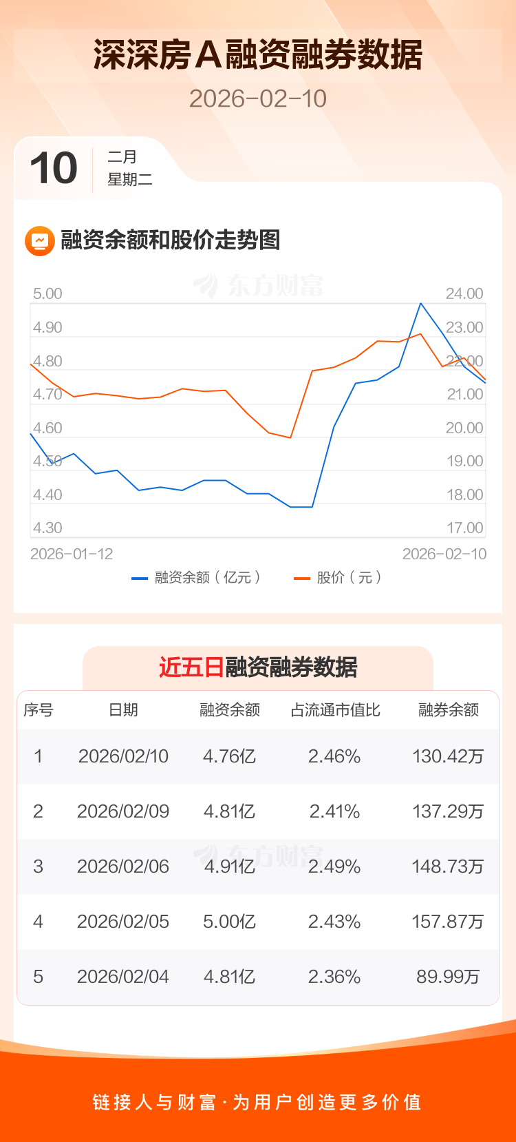 交易所最新数据显示,深深房A于2026年2月10日获融资买入992.24万元,融资偿还1508.46万元,当日融资净偿还516.22万元。目前,该股融资余额4.76亿,占流通市值比例为2.46%。