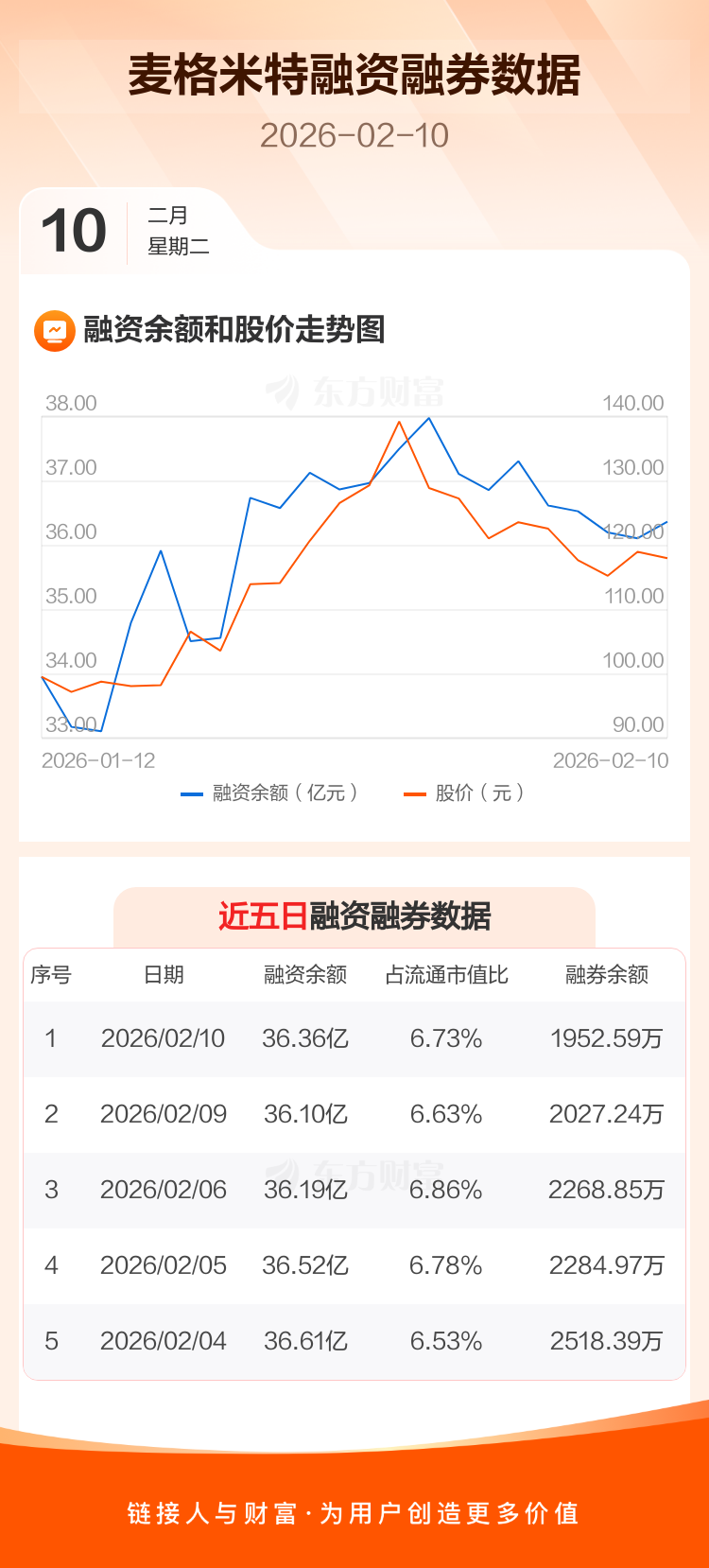 交易所最新数据显示,麦格米特于2026年2月10日获融资买入1.56亿元,融资偿还1.30亿元,当日融资净买入2563.33万元。目前,该股融资余额36.36亿,占流通市值比例为6.73%。