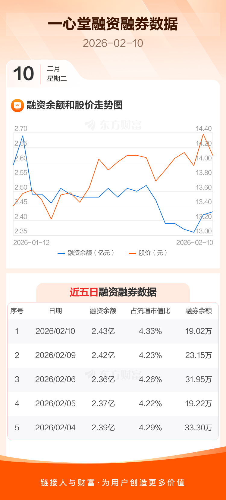 交易所最新数据显示,一心堂于2026年2月10日获融资买入3040.97万元,融资偿还2959.80万元,当日融资净买入81.17万元。目前,该股融资余额2.43亿,占流通市值比例为4.33%。
