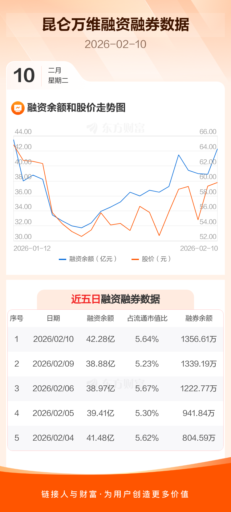 交易所最新数据显示,昆仑万维于2026年2月10日获融资买入11.01亿元,融资偿还7.61亿元,当日融资净买入3.4亿元。目前,该股融资余额42.28亿,占流通市值比例为5.64%。
