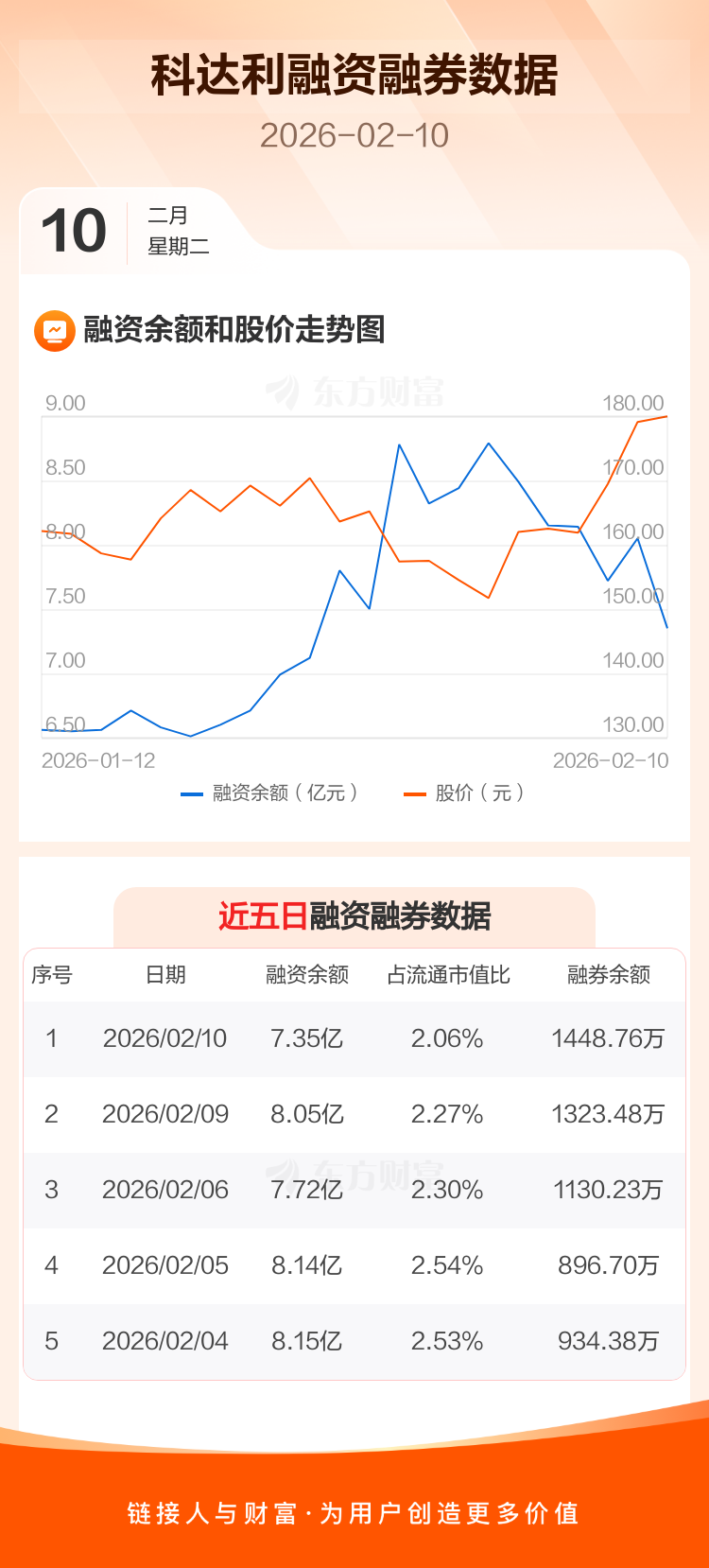 交易所最新数据显示,科达利于2026年2月10日获融资买入7783.12万元,融资偿还1.48亿元,当日融资净偿还6996.26万元。目前,该股融资余额7.35亿,占流通市值比例为2.06%。