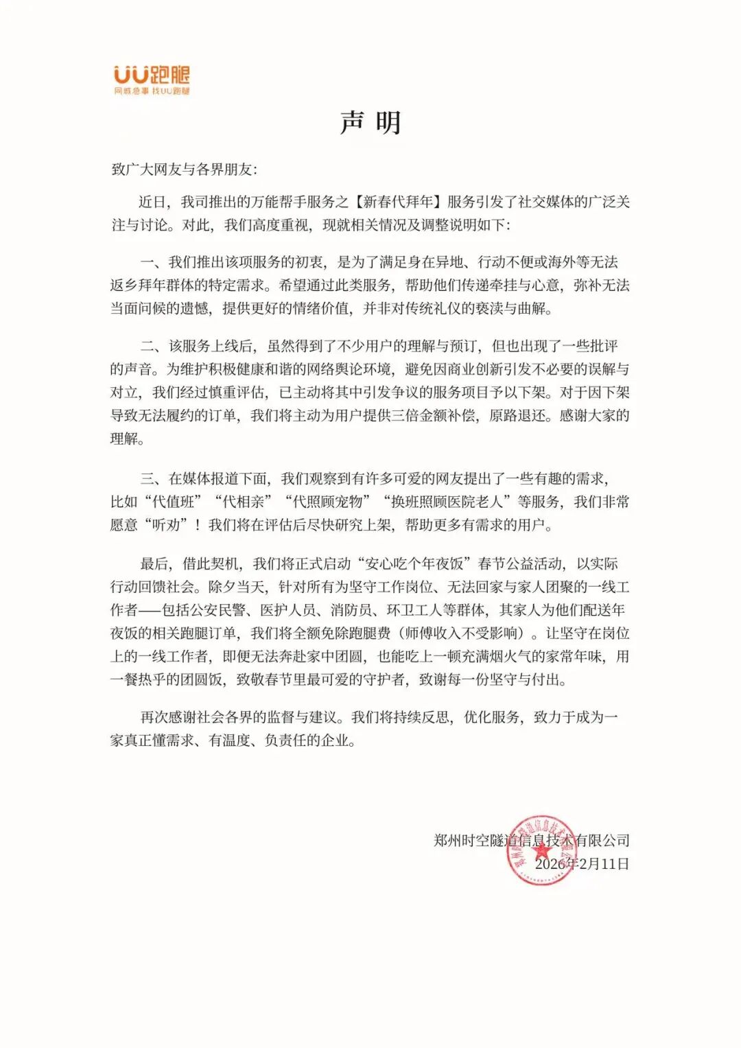 每经AI快讯,2月11日,UU跑腿发布关于代拜年服务的情况说明:近日,我司推出的万能帮手服务之【新春代拜年】服务引发了社交媒体的广泛关注与讨论。对此,我们高度重视,现就相关情况及调整说明如下: