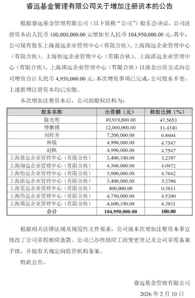 2月10日,睿远基金公告已完成注册资本变更,员工持股平台通过现金增资495万元,使公司注册资本从1亿元提升至1.0495亿元。增资后,实际控制人陈光明持股比例调整为47.5653%,7家员工持股平台合计持股24.6309%。此次增资未改变原有股东结构,工商变更登记及公司章程备案已同步完成。