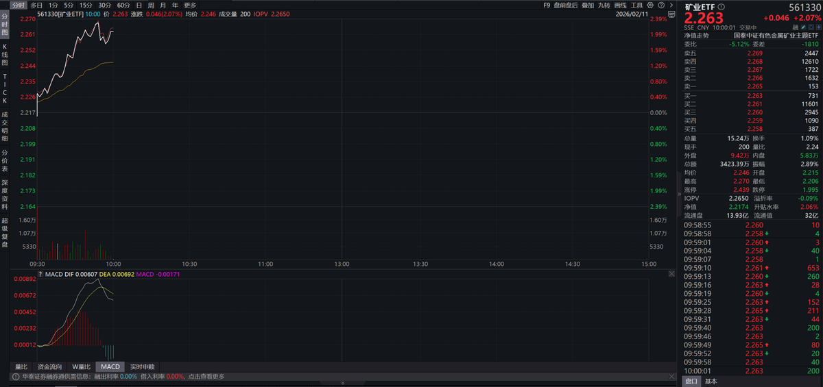 近期,钨价持续突破历史新高,在地缘政治博弈及商品行情启动的背景下,有色金属板块再次成为全球资本市场的焦点, “家里有矿,2025年涨超有色”的矿业ETF(561330)涨超2%,资金持续布局,近20日净流入超13亿元。
