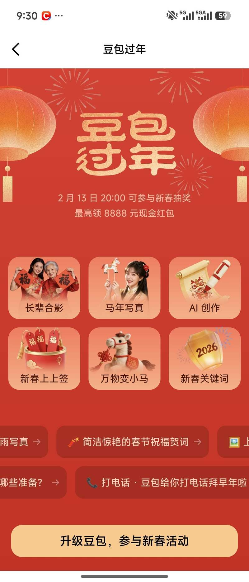 点击该选项,出现的页面显示,“2月13日20:00可参与新春抽奖,最高领8888元现金红包”,底部写有“升级豆包,参与新春活动”字样。