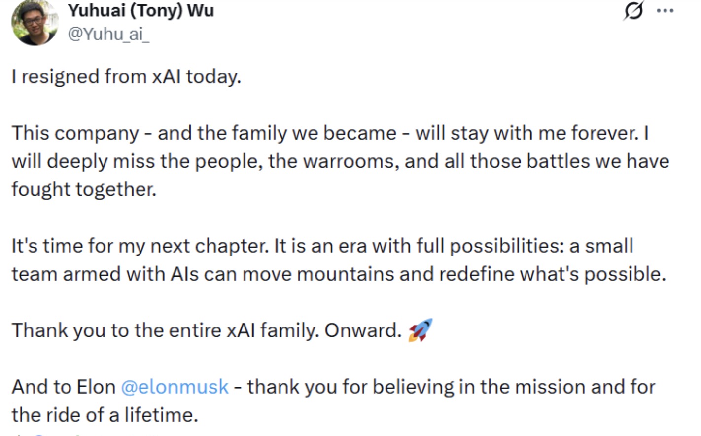 吉米 · 巴是不到48小时内xAI第二位离职的联合创始人。2月10日,另一位联合创始人吴宇怀在社媒上发帖宣布从xAI公司离职,他表达了对这家公司的怀念和感谢全体同事,同时也感谢马斯克对“使命的信任”。