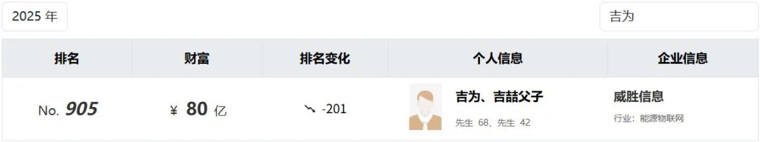 吉为及其一致行动人,IPO前,持有59.86%惟远股份。这位69岁的能源大佬,曾以80亿元身家,跻身《2025年胡润百富榜》,手头还有一家上市公司威胜控股。