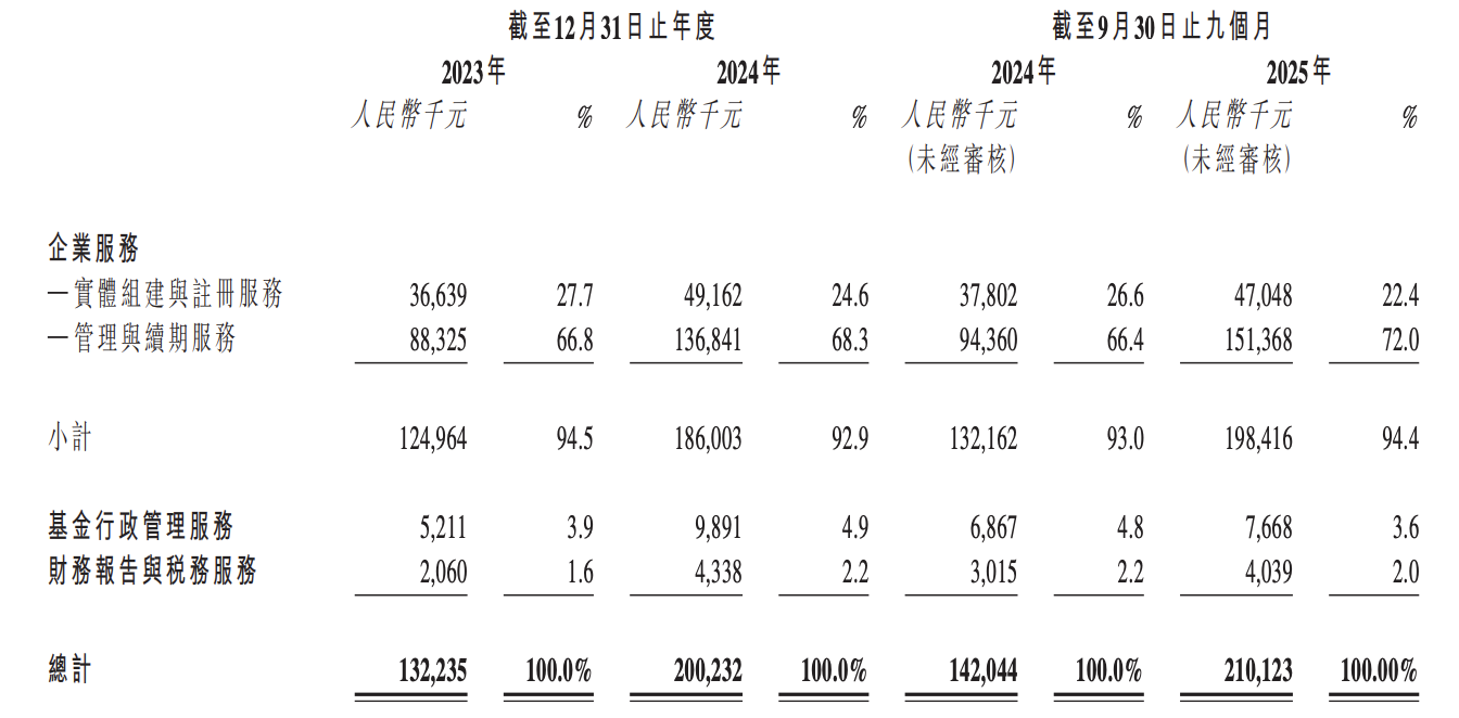 于2023年、2024年及截至2024年及2025年9月30日止九个月期间,企业服务分部产生的收入分别为1.25亿元、1.86亿元、1.32亿元及1.98亿元,占同期收入总额94.5%、92.9%、93.0%及94.4%。其中,持续管理及续约服务作为最大单项收入来源,在业绩记录期各期间分别占收入总额的66.8%、68.3%、66.4%及72.0%。