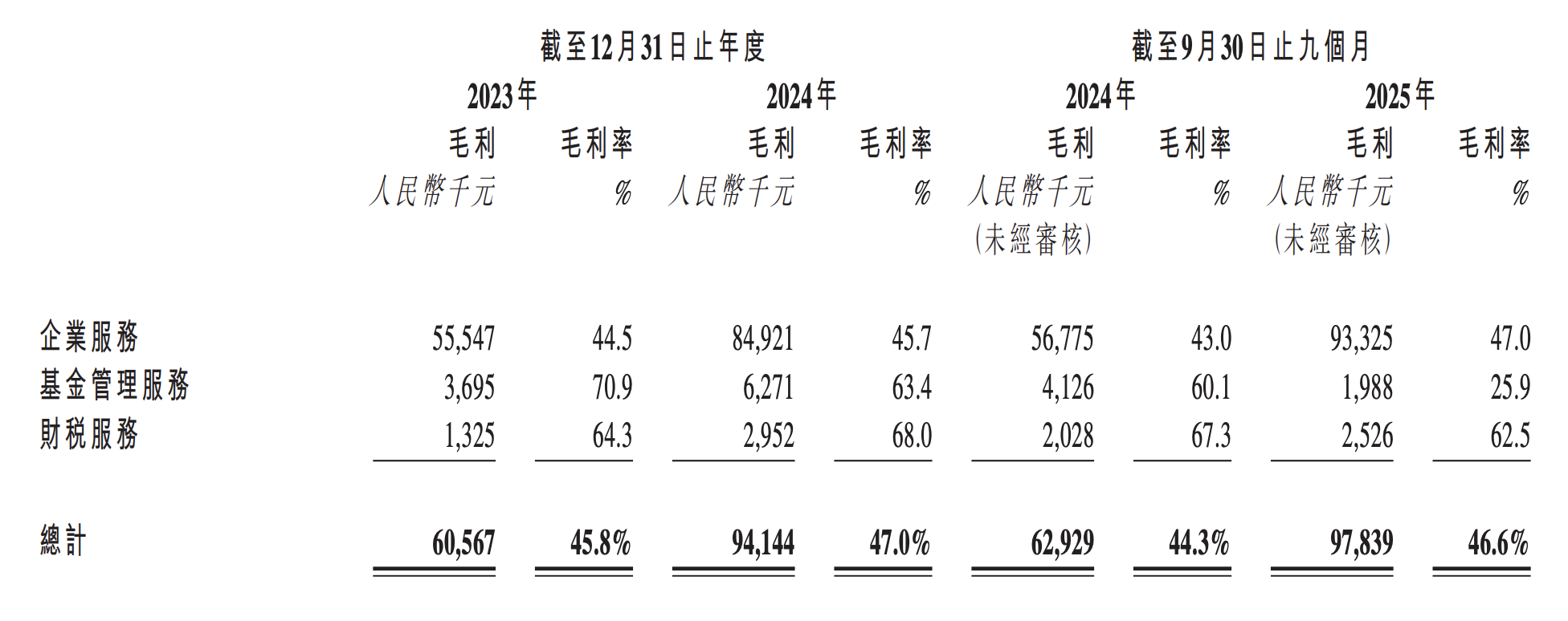 企业服务作为核心收入来源,其毛利率在2023年至2025年前三季度分别为44.5%、45.7%及47.0%,呈现缓慢爬升态势;然而,基金管理服务的毛利率却从2023年的70.9%骤降至2025年前三季度的25.9%,跌幅达到45个百分点。