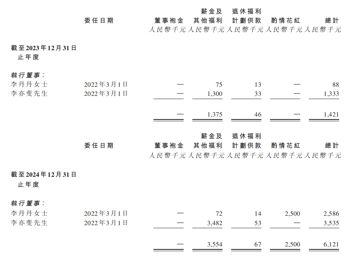 2023年及2024年,李亦斐的年薪均高于李丹丹。