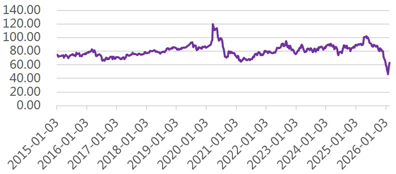 2025年以来,金银比出现巨幅波动。2025年上半年,贵金属牛市主线由宏观避险情绪、政策不确定性与流动性宽松共振推动,黄金与白银价格均大幅上行,但黄金市场更具深度且全球央行储备属性更强,这使黄金在极端避险情绪推动下先行上涨。这一阶段金银比一度升至100以上,接近历史峰值。进入2025年下半年,白银价格开始加速补涨。尤其是2025年年末至2026年年初,白银在三重因素驱动下出现了大幅度、高斜率的上涨行情:第一,资金层面,白银作为高贝塔资产,在资金追涨情绪中,波动幅度和涨幅往往更大。二是库存与现货紧张。伦敦可交割库存持续低位运行,ETF对实物库存的占用率高企、租赁利率飙升,放大了白银对资金流入的响应。三是供需错配。实物供给紧张叠加出口套利与现货流动性约束,使得白银价格在短期内表现极为强劲。