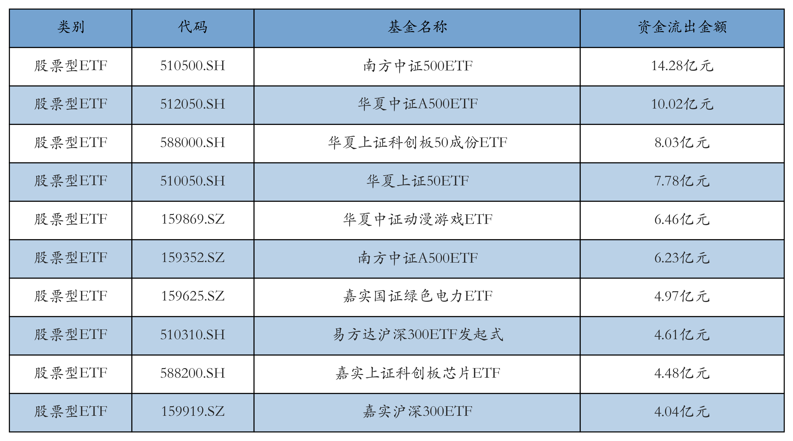 昨日股票型ETF资金流出最多的3只ETF及其流出金额分别为:南方中证500ETF(流出14.28亿元)、华夏中证A500ETF(流出10.02亿元)、华夏上证科创板50成份ETF(流出8.03亿元)。资金流出前10详情见下表: