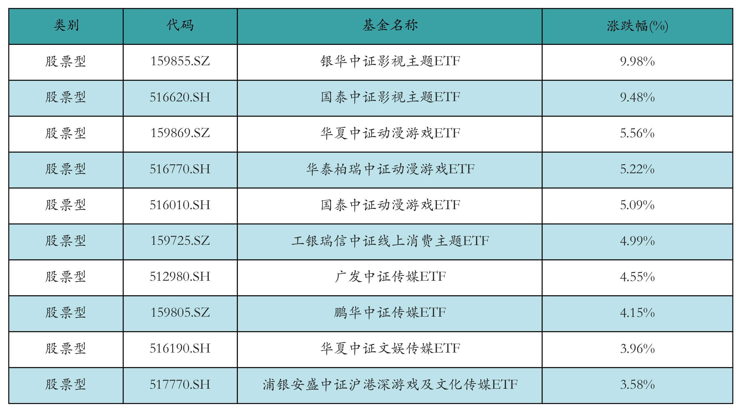 昨日股票型ETF涨幅最高的3只ETF及其收益率分别为:银华中证影视主题ETF(9.98%)、国泰中证影视主题ETF(9.48%)、华夏中证动漫游戏ETF(5.56%)。涨幅前10详情见下表: