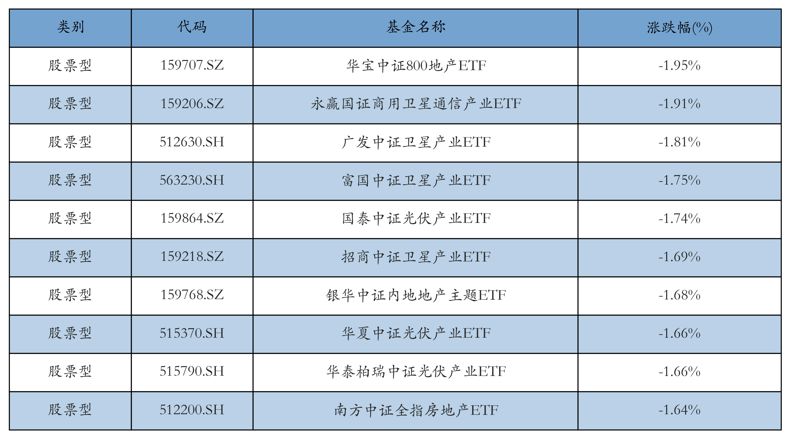昨日股票型ETF跌幅最大的3只ETF及其收益率分别为:华宝中证800地产ETF(-1.95%)、永赢国证商用卫星通信产业ETF(-1.91%)、广发中证卫星产业ETF(-1.81%)。跌幅前10详情见下表: