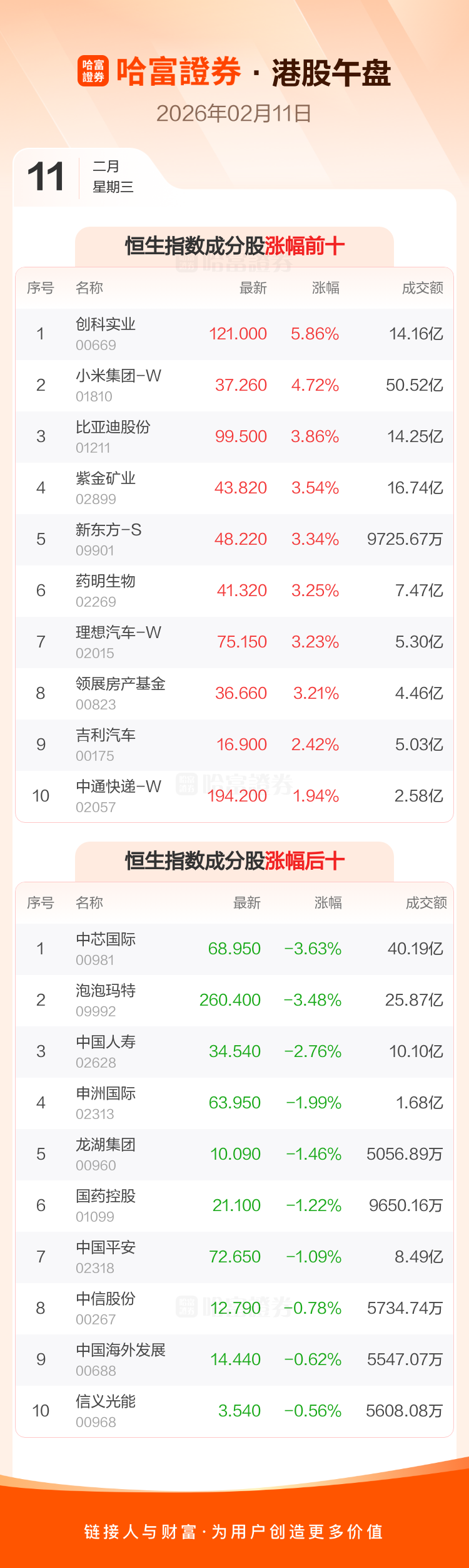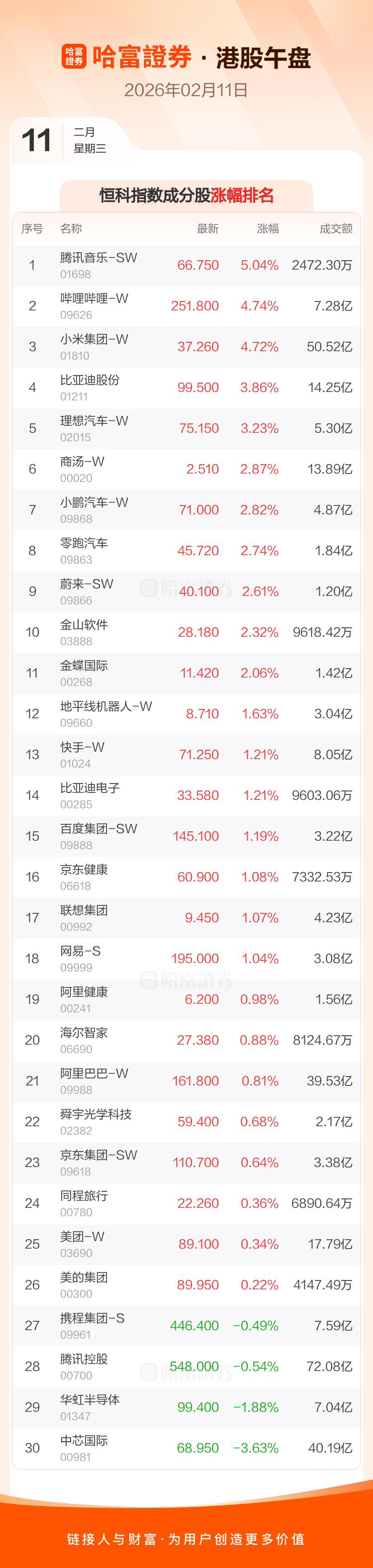 港股2月11日午盘走高,恒生指数收报27299.88点,涨116.73点,涨幅0.43%;恒生科技指数收报5510.82点,涨59.79点,涨幅1.1%。恒生指数成分股中创科实业、小米集团-W、比亚迪股份涨幅居前,中芯国际、泡泡玛特、中国人寿跌幅靠前。恒生科技指数成分股中腾讯音乐-SW、哔哩哔哩-W、小米集团-W涨幅居前,中芯国际、华虹半导体、腾讯控股跌幅靠前。