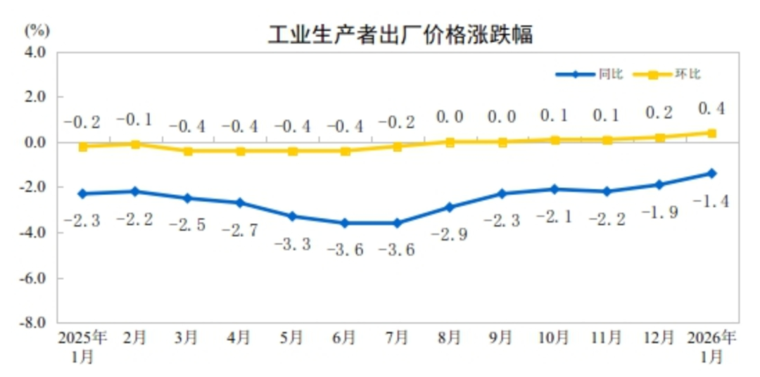 数据显示,1月PPI环比上涨0.4%,连续4个月上涨,涨幅比上月扩大0.2个百分点。