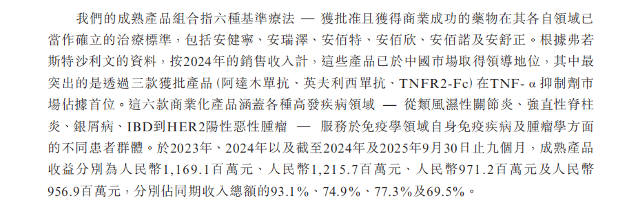 《财中社》注意到,公司创新药成色不足,类似药“挑大梁”。博锐生物定位为“创新生物制药公司”,但从收入贡献来看,其目前的造血核心依然是生物类似药。根据招股书数据,公司营收中约七成来自于成熟产品(主要为生物类似药)。2025年前三季度,成熟产品收入占比虽有下降,但仍高达69.5%,而创新产品(自研的安瑞昔与2024年通过CSO模式引入的“舶来品”倍捷乐 )营收占比仅为19.8%。