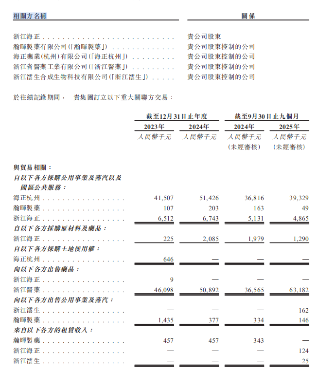 海正药业(及其子公司)不仅是博锐生物的股东,还是其主要供应商。博锐生物向海正药业采购公用事业(水、电、汽)及园区公共服务。2023年及2024年,仅向海正杭州采购公用事业及服务的金额就分别达到4151万元和5143万元。