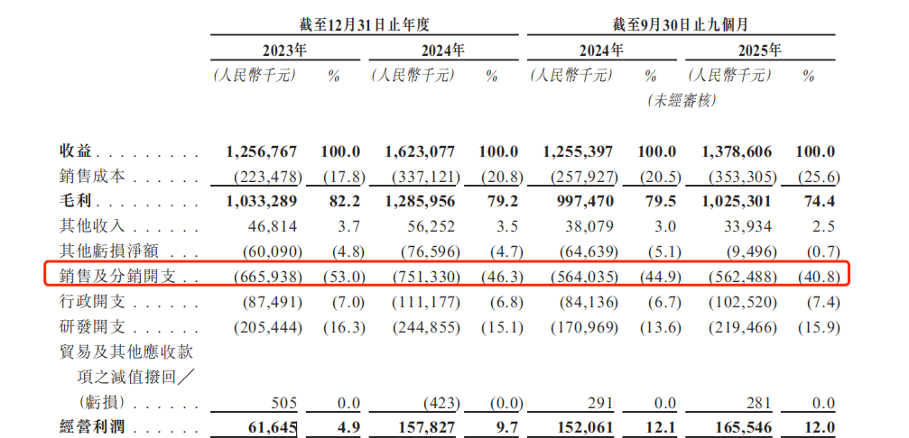 《财中社》注意到,在毛利率承压的同时,公司销售及分销开支在过去几年维持在高位。2023年及2024年,该项支出分别为6.7亿元和7.5亿元,占当期营收的比例分别高达53%和46.3%。
