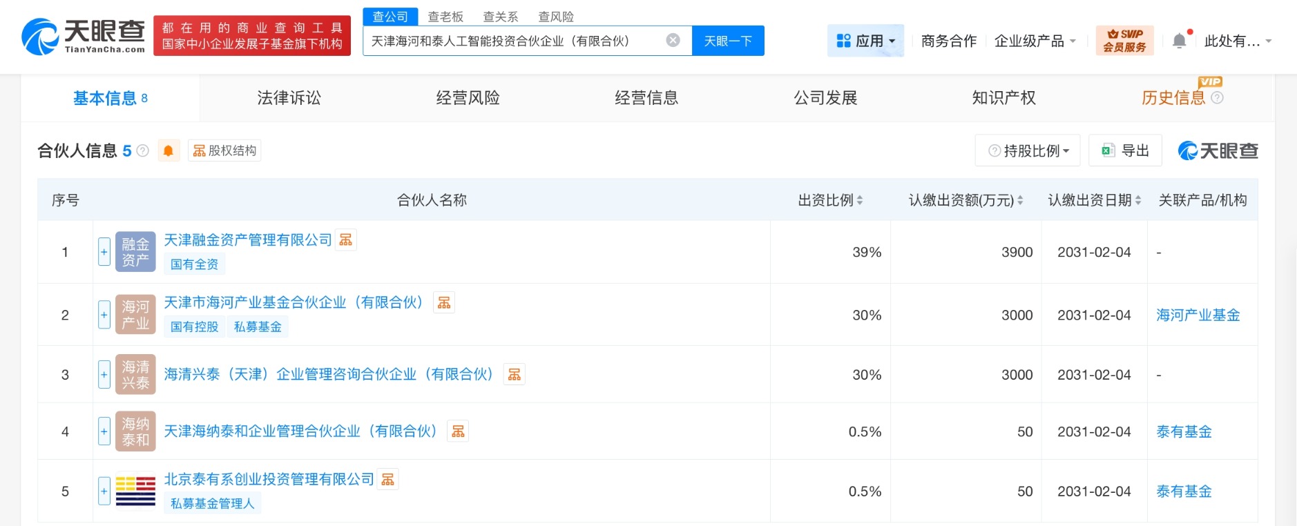 南方财经2月11日电,天眼查App显示,近日,天津海河和泰人工智能投资合伙企业(有限合伙)成立,执行事务合伙人为天津海纳泰和企业管理合伙企业(有限合伙),出资额1亿人民币,经营范围为创业投资、以自有资金从事投资活动。合伙人信息显示,该合伙企业由天津融金资产管理有限公司、天津市海河产业基金合伙企业(有限合伙)、海清兴泰(天津)企业管理咨询合伙企业(有限合伙)等共同出资。