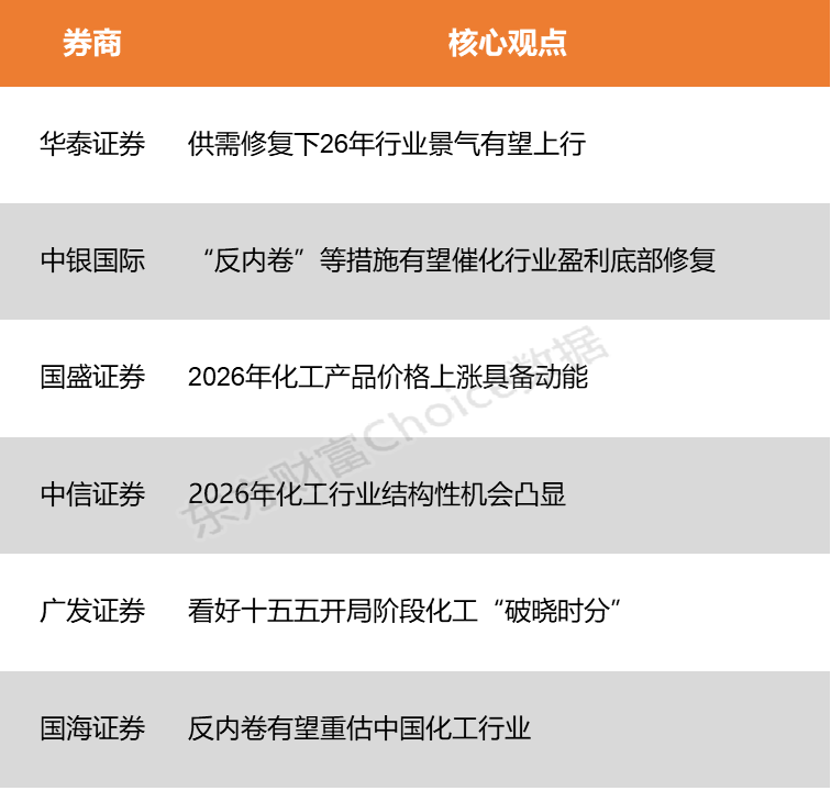华泰证券表示,近年来行业盈利已处底部,在反内卷等政策引导下,供给侧有望加快调整,大宗化工品盈利或迎改善。中银国际指出,展望2026年,本轮基础化工与化学制品行业扩产已近尾声,“反内卷”等措施有望催化行业盈利底部修复。同时,新材料受益于下游需求的快速发展,有望开启新一轮高成长。