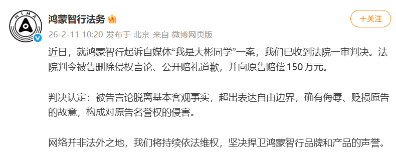 【大河财立方消息】2月11日,鸿蒙智行法务在社交媒体发文称,起诉自媒体“我是大彬同学”一案,已收到法院一审判决。法院判令被告删除侵权言论、公开赔礼道歉,并向原告赔偿150万元。判决认定:被告言论脱离基本客观事实,超出表达自由边界,确有侮辱、贬损原告的故意,构成对原告名誉权的侵害。