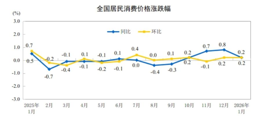 国家统计局数据显示,2026年1月份,全国居民消费价格同比上涨0.2%。其中,城市上涨0.2%,农村上涨0.1%;食品价格下降0.7%,非食品价格上涨0.4%;消费品价格上涨0.3%,服务价格上涨0.1%。