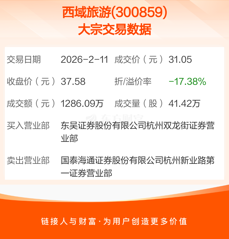 2026年2月11日,西域旅游发生1笔大宗交易,共成交41.42万股,成交金额1286.09万元,占其流通市值比例为0.22%。