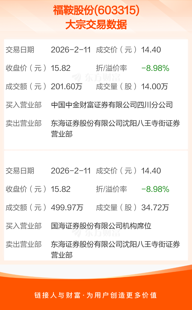 2026年2月11日,福鞍股份发生2笔大宗交易,共成交48.72万股,成交金额701.57万元,占其流通市值比例为0.14%。