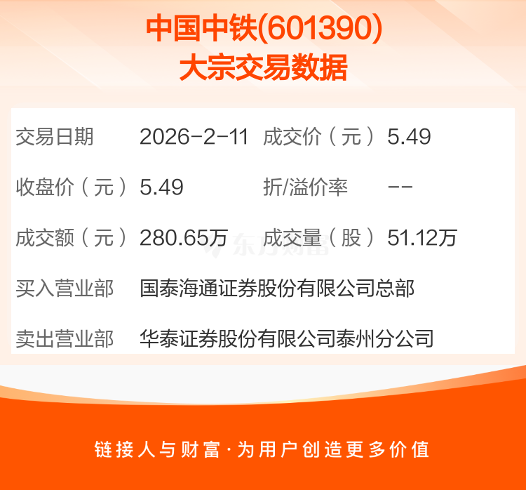 2026年2月11日,中国中铁发生1笔大宗交易,共成交51.12万股,成交金额280.65万元。
