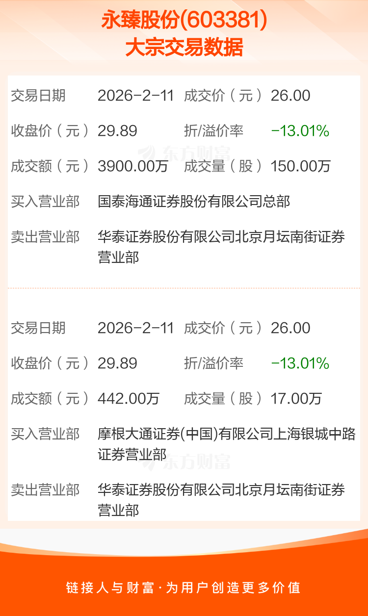 2026年2月11日,永臻股份发生2笔大宗交易,共成交167.00万股,成交金额4342.00万元,占其流通市值比例为1.02%。