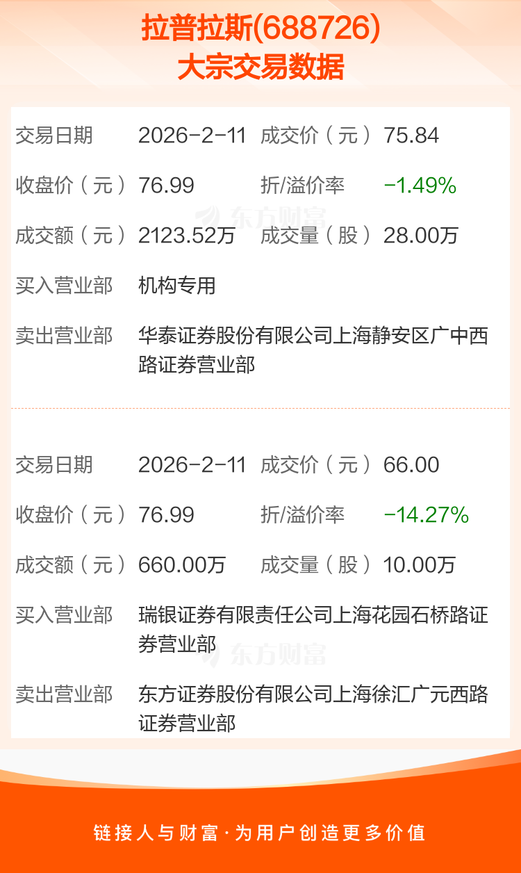 2026年2月11日,拉普拉斯发生2笔大宗交易,共成交38.00万股,成交金额2783.52万元,占其流通市值比例为0.16%。