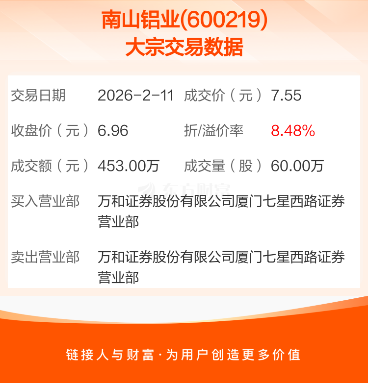 2026年2月11日,南山铝业发生1笔大宗交易,共成交60.00万股,成交金额453.00万元。