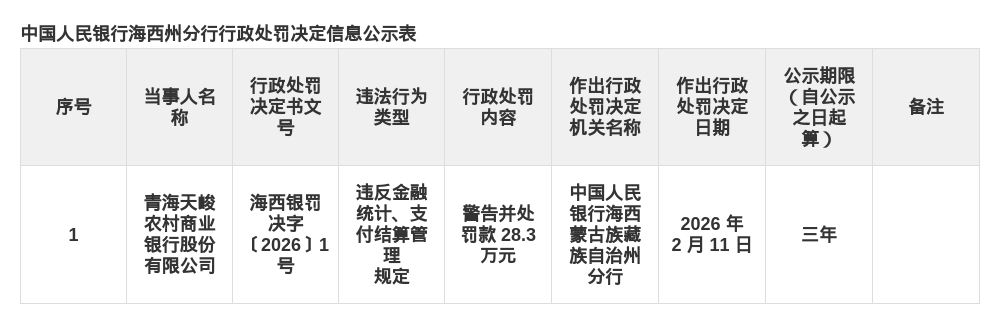 青海天峻农商行被罚28.3万,涉违反金融统计及支付结算管理规定