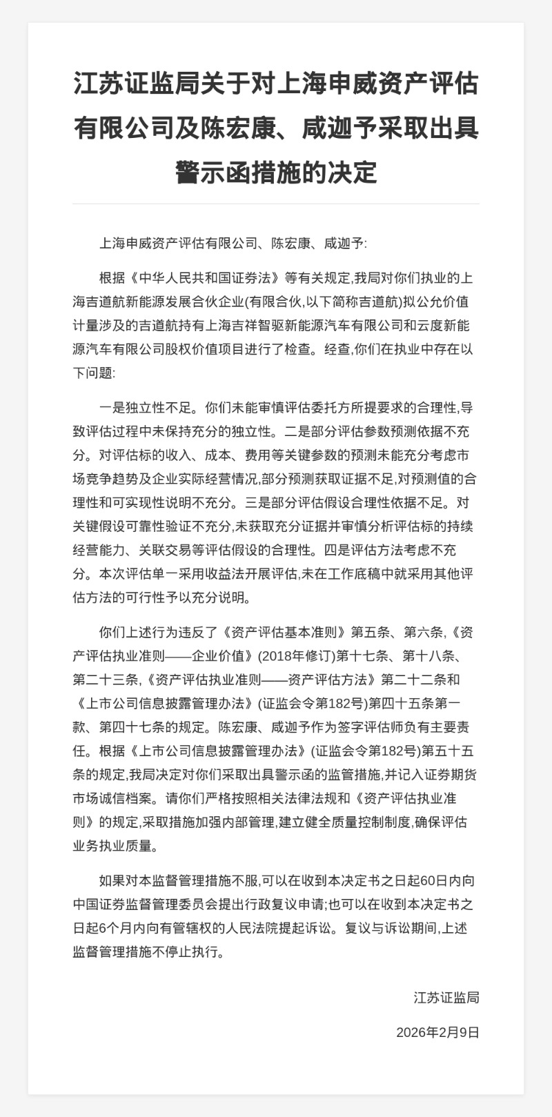蓝鲸新闻2月11日讯,近日,江苏证监局发布行政监管措施决定书,剑指上海申威资产评估有限公司、陈宏康、咸迦予。