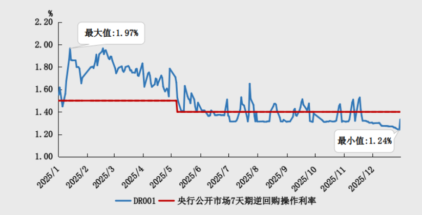 2025年,银行业存款类金融机构间利率债隔夜质押式回购(DR001)年加权平均利率为1.46%,较2024年下降19个基点;DR007年加权平均利率为1.63%,较2024年下降19个基点;银行间市场隔夜质押式回购(R001)年加权平均利率为1.55%,较2024年下降21个基点。2025年,DR001与央行公开市场7天期逆回购操作利率的利差日均值为7个基点,R001与DR001的利差日均值为8个基点。