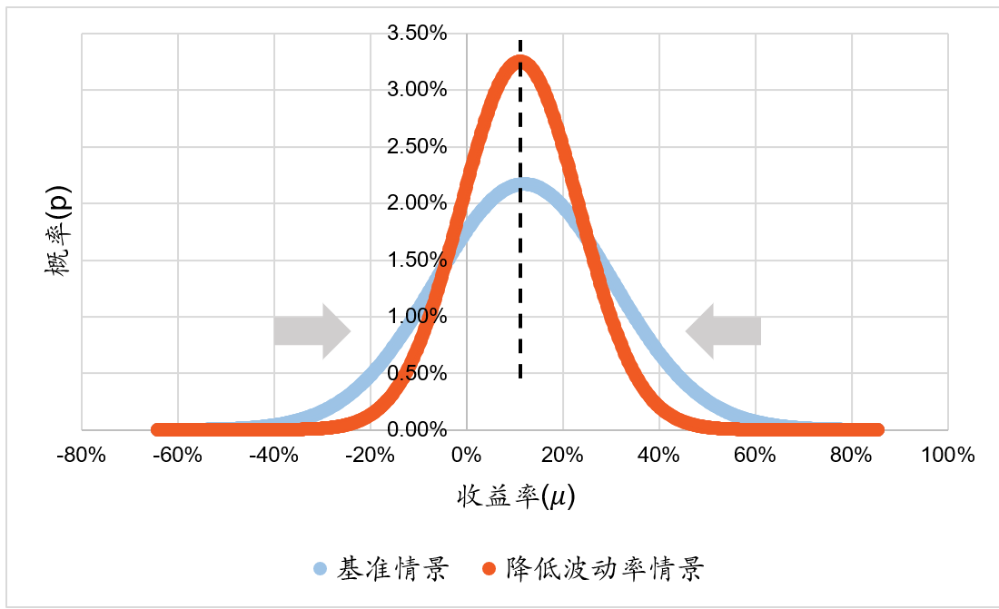图4:其他条件不变降低资产波动率后收益概率分布变化