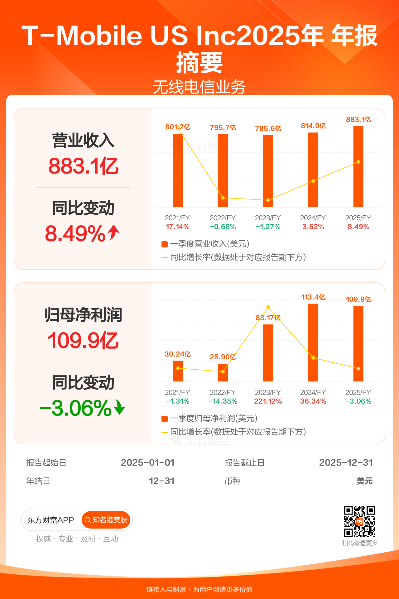 T-Mobile US Inc2月11日发布年报业绩,截至2025年12月31日的12个月内,该公司营业收入883.09亿美元,同比增长8.49%;公司权益持有人应占溢利(归母净利润)109.92亿美元,同比减少3.06%。