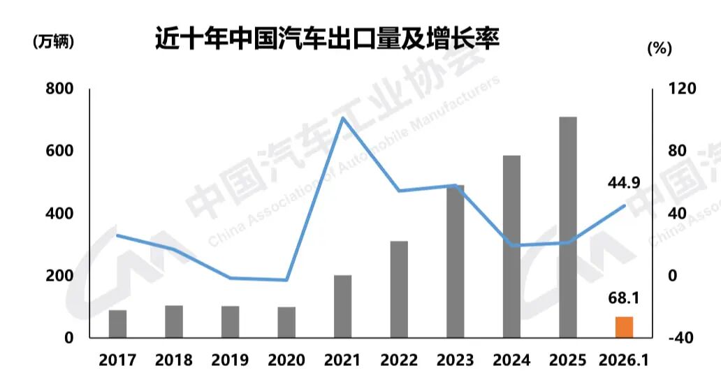 在出口方面,中汽协数据显示,1月,中国汽车出口68.1万辆,同比增长44.9%,环比下降9.5%。1月,中国新能源汽车出口30.2万辆,同比增长1倍,环比增长0.5%;传统燃料汽车出口38万辆,同比增长18.8%,环比下降16.1%。