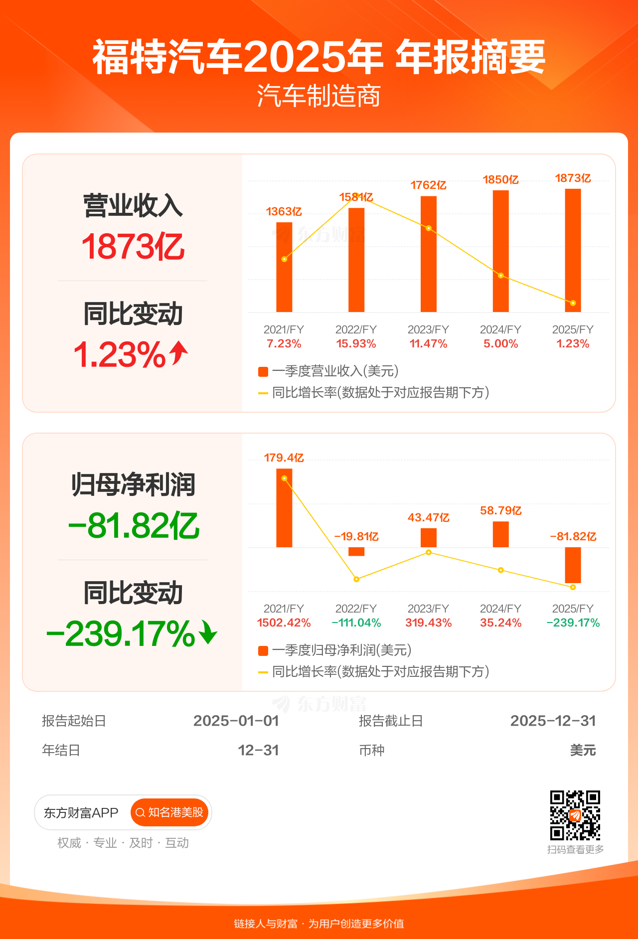 福特汽车2月10日发布年报业绩,截至2025年12月31日的12个月内,该公司营业收入1872.67亿美元,同比增长1.23%;公司权益持有人应占溢利(归母净利润)-81.82亿美元,上年同期58.79亿美元。