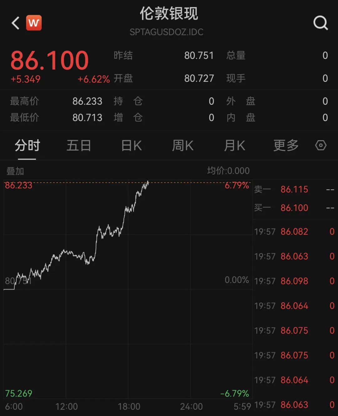 2月11日,黄金、白银再度爆发,截至发稿,伦敦金现涨超1.5%,COMEX黄金涨超2%,均重回5100美元/盎司上方;伦敦银现、COMEX白银双双大涨超6%,其中伦敦银现再度站上86美元/盎司。