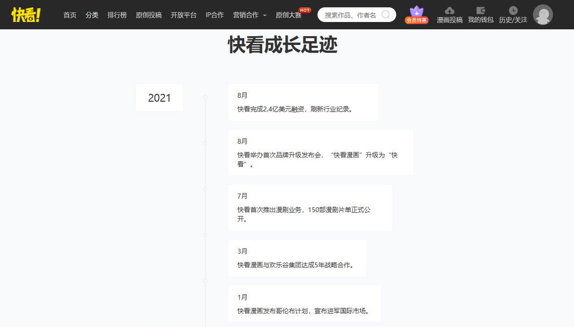 但此后,快看就如同公司官网的“成长足迹”,把巅峰停在了那一刻。