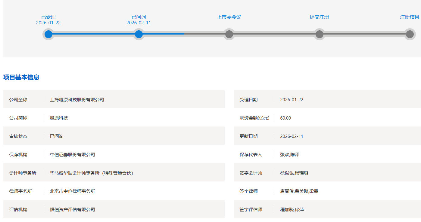 【大河财立方消息】2月11日,上交所官网显示,上海燧原科技股份有限公司(以下简称:燧原科技)科创板IPO审核状态变更为“已问询”。