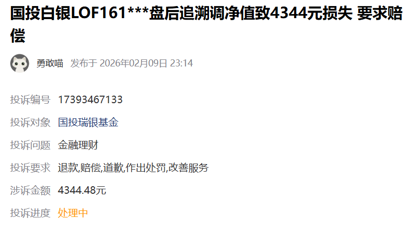 据黑猫投诉,投资者张宏(化名)称,他在手机银行购买白银LOF基金C份额,该基金涉及信息披露违规,当天收盘后才告知净值调整根据国际白银涨跌幅,2月2日当天净值下跌31.5%,导致其当天亏损18146元。之后,张宏又亏损28142元,合计亏损46288元,他投诉要求国投瑞银基金退回其损失。