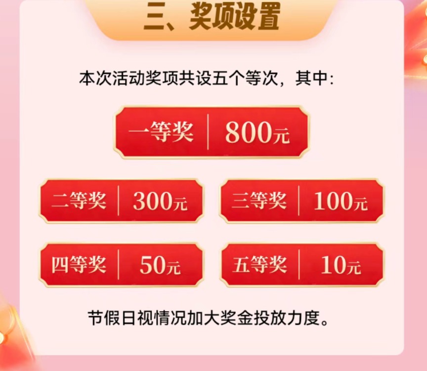 奖项设置方面,本次活动突出普惠性,共设五个等次,活动奖金总额达3亿元,具体奖项为:一等奖800元、二等奖300元、三等奖100元、四等奖50元和五等奖10元。其中,100元及以下的小额奖项占比更高,确保更多参与者能分享喜悦、获得实惠。