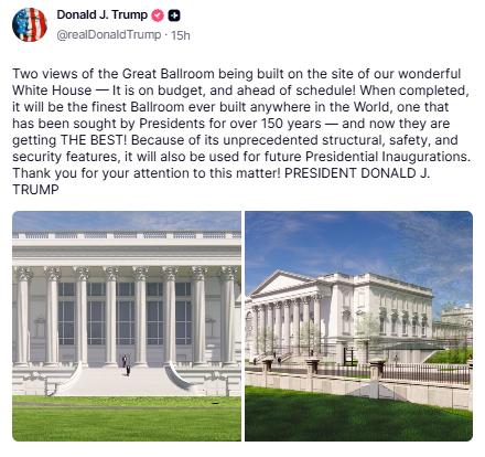 特朗普发文称,“正按预算推进,且进度超前!建成后,这将是全世界有史以来最精美的宴会厅,是历届总统期盼了150多年之久的梦想——如今,他们即将迎来‘至臻之选’!凭借其前所未有的结构设计、安全防护与安保设施,它还将用于未来的总统就职典礼。感谢诸位对此事的关注!”