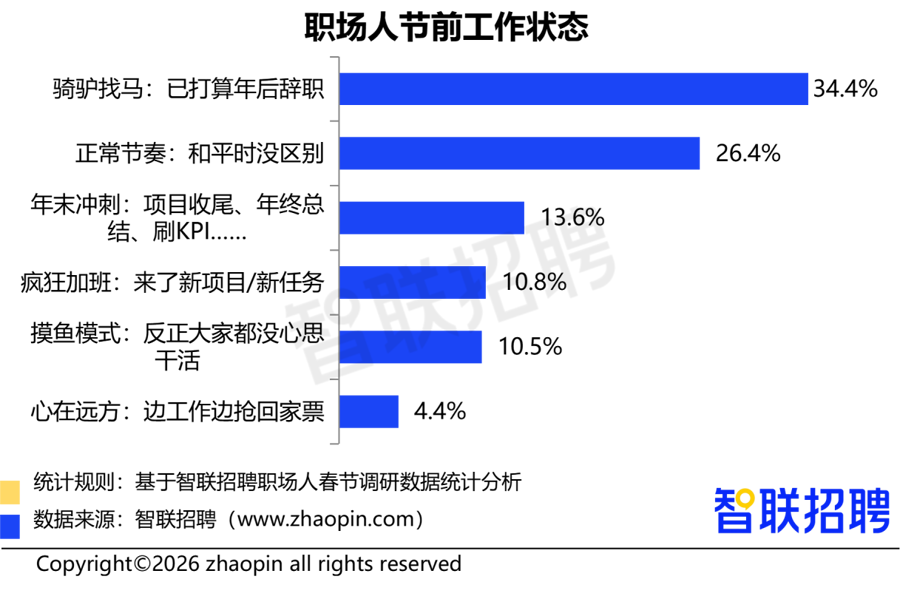 调研数据显示,有34.4%的职场人已经“身在曹营心在汉”,默默盘算着年后离职。春节前后通常是离职高峰期,不少人会趁着假期短暂休息后重新出发。不过,也有13.6%的打工人正在全力冲刺——项目收尾、冲KPI等,忙得根本停不下来;还有10.8%的人因为新项目、新需求突然“杀到”,直接切换成“疯狂加班模式”,仅26.4%淡定如常,仿佛春节前也只是普普通通的一个星期五。
